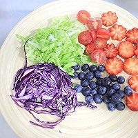 做法分解13:煮面条的时候已将沙拉的菜料处理好了:生菜和紫甘蓝切细丝,樱桃番茄对半切,蓝莓清洗干净,草莓切块或者整颗均可,如果有闲空儿,像我这样切几个花刀也成;