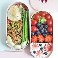 荞麦面1把,圆白菜1块,胡萝卜半根,小葱1棵,油少许,酱油15克,盐1克,蓝雪美露鳕鱼柳2块,芦笋数根,百合1碟,紫甘蓝1块,生菜2片,草莓数颗,蓝莓1把,樱桃西红柿数颗,原味酸奶1杯