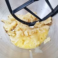 做法分解8:然后分次加入蛋液,每次加入都用搅拌浆搅拌至完全融合。没有厨师机的话用刮刀搅拌,时间会比较长,刚开始时会比较费劲。