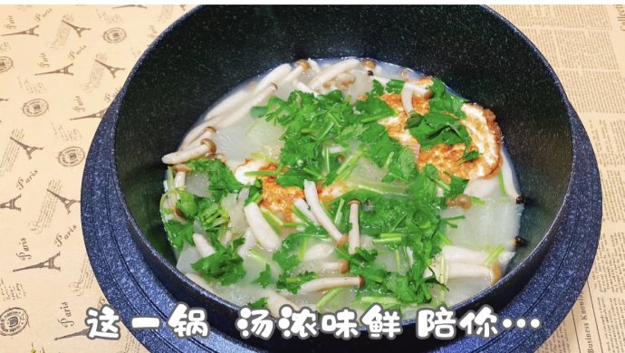 鸡蛋2个,蟹味菇200g,冬瓜250克,香菜2片,食盐3克,白胡椒粉2克