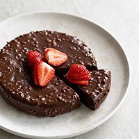 做法分解11:做巧克力淋面:黑巧克力放进无油无水的碗里隔水融化,加入植物油和榛子碎搅匀做成巧克力酱。