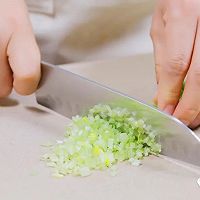 做法分解4:把芹菜切碎。虽然我用的是芹菜,不过你们也可以换成别的蔬菜,宝宝爱吃就行,比如胡萝卜啊、西蓝花之类的。