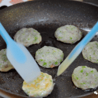 做法分解9:开小火,煎虾饼底部定型后翻面,这里的虾饼你们就做小一点,特别好熟。