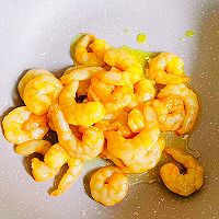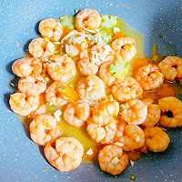 做法分解11:下油锅爆炒虾仁,先下葱白,再入浆好的虾仁