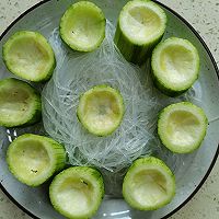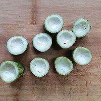 做法分解3:丝瓜切成9段,有一段稍微长点,我切了一小段放在中间做装饰了,从一端挖个坑。