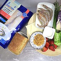 多谷无油吐司4片,鳕鱼柳2块,虾5只,原味酸奶1杯,奶酪片2片,芦笋4根,紫甘蓝1块,生菜3片,樱桃番茄4颗,草莓4颗,肉松少许,植物油少许