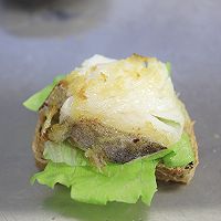 做法分解5:生菜将肉松包裹住,上面放一块鳕鱼柳;