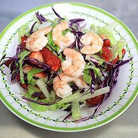 做法分解11:取适量紫甘蓝、生菜切细丝,草莓、番茄切块,倒入虾仁;