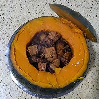 做法分解5:把烧干收汁的红烧肉豆腐盛入板栗南瓜中,装入不锈钢盆,并放进高压锅里。