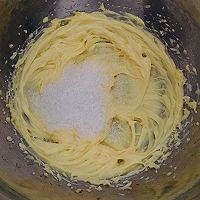 做法分解15:黄油提前室温充分软化好后加入细砂糖及盐打发至蓬松发白。