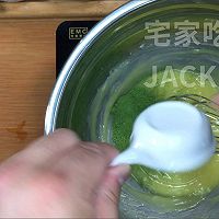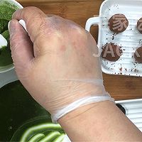 做法分解10:准备一碗抹茶粉,用两个勺子交叉挖成小球,丢入抹茶粉中。