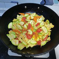 做法分解8:加入茭瓜和胡萝卜片翻炒,加入生抽翻炒,个人根据自己口味加盐。