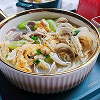 丝瓜1根,白蛤200克,鸡蛋1个,金针菇50克,小葱2根,白胡椒少许,盐少许,橄榄油适量
