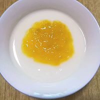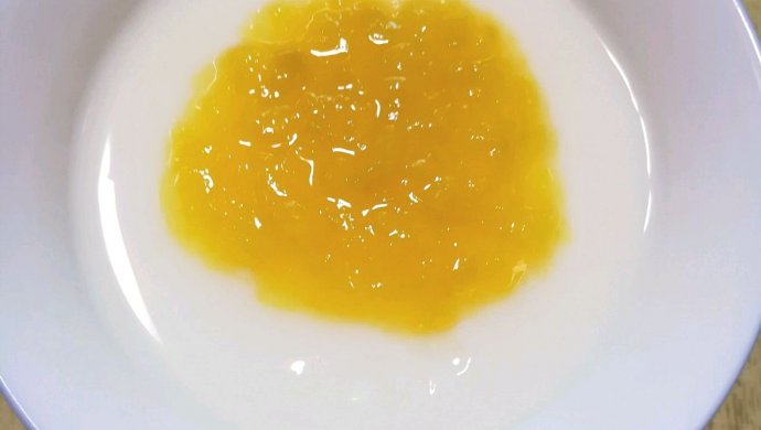 做法分解8:蒸好的双皮奶拿出放凉放上芒果酱