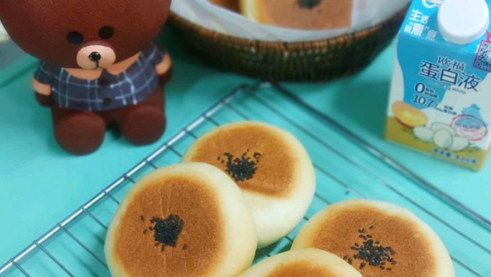 欧福蛋白液65克,牛奶90-100克,高筋粉250克,糖20克,酵母3克,盐2克,黄油17克,黑芝麻适量(装饰),红豆沙240克