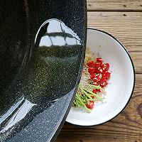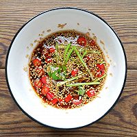 做法分解5:把蒜泥,小米辣圈,香菜梗,白芝麻放入碗中,起锅烧油,带油温9成热后,浇在配料上,激发出香味。