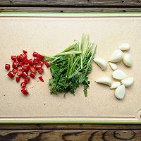 做法分解3:小米辣切圈,香菜切寸断,蒜去皮去蒂。