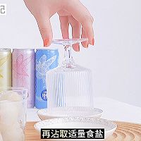 做法分解1:鲜荔枝洗净放冰箱冷藏降温,取出去除荔枝皮,杯口沾蜂蜜