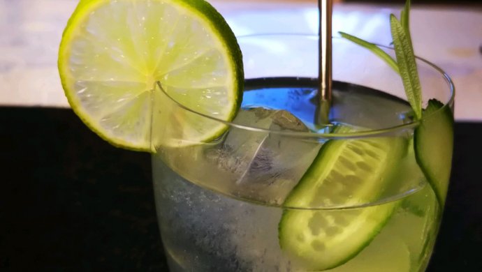 金酒60ml,青柠檬1个,冰块2大颗,汤力水(金色)200ml,水果黄瓜半根,新鲜迷迭香2段