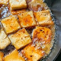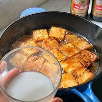 做法分解9:放入煎好的豆腐,轻轻晃动锅,让豆腐均匀平铺,千万别翻动,防止豆腐碎掉