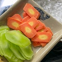 做法分解5:胡萝卜和莴笋切片在沸水中汆一下