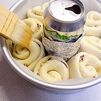 做法分解11:取八寸蛋糕模具,将卷好的8个坯子围成一圈,中间放一个包了锡纸的易拉罐,让花环固定;