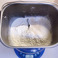 做法分解2:往面包桶里加入盐2克、糖30克、牛奶125毫升、高筋面粉200克、低筋面粉20克以及酵母3克;