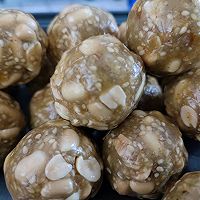 做法分解3:花生我都是自己烤,芝麻自己炒的,芝麻炒熟后用擀面杖擀一下,芝麻的香味就出来了,特别特别的香,把花生也稍微敲碎点,不要太碎,把莲蓉和花生芝麻,糖渍橙皮丁,称重放在一起,抓捏成团。