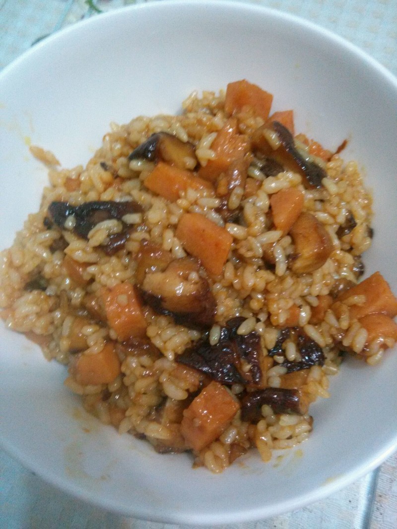 2、将大米中放些色拉油,同时放入香菇粒然后开始煮。