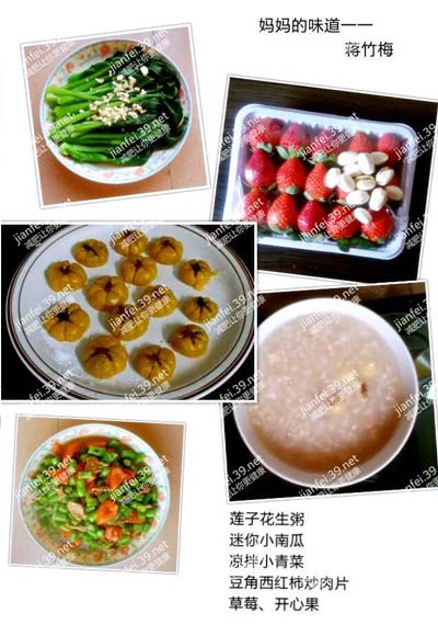 莲子花生粥、迷你小南瓜、凉拌青菜、豆角西红柿炒肉片、草莓、开心果