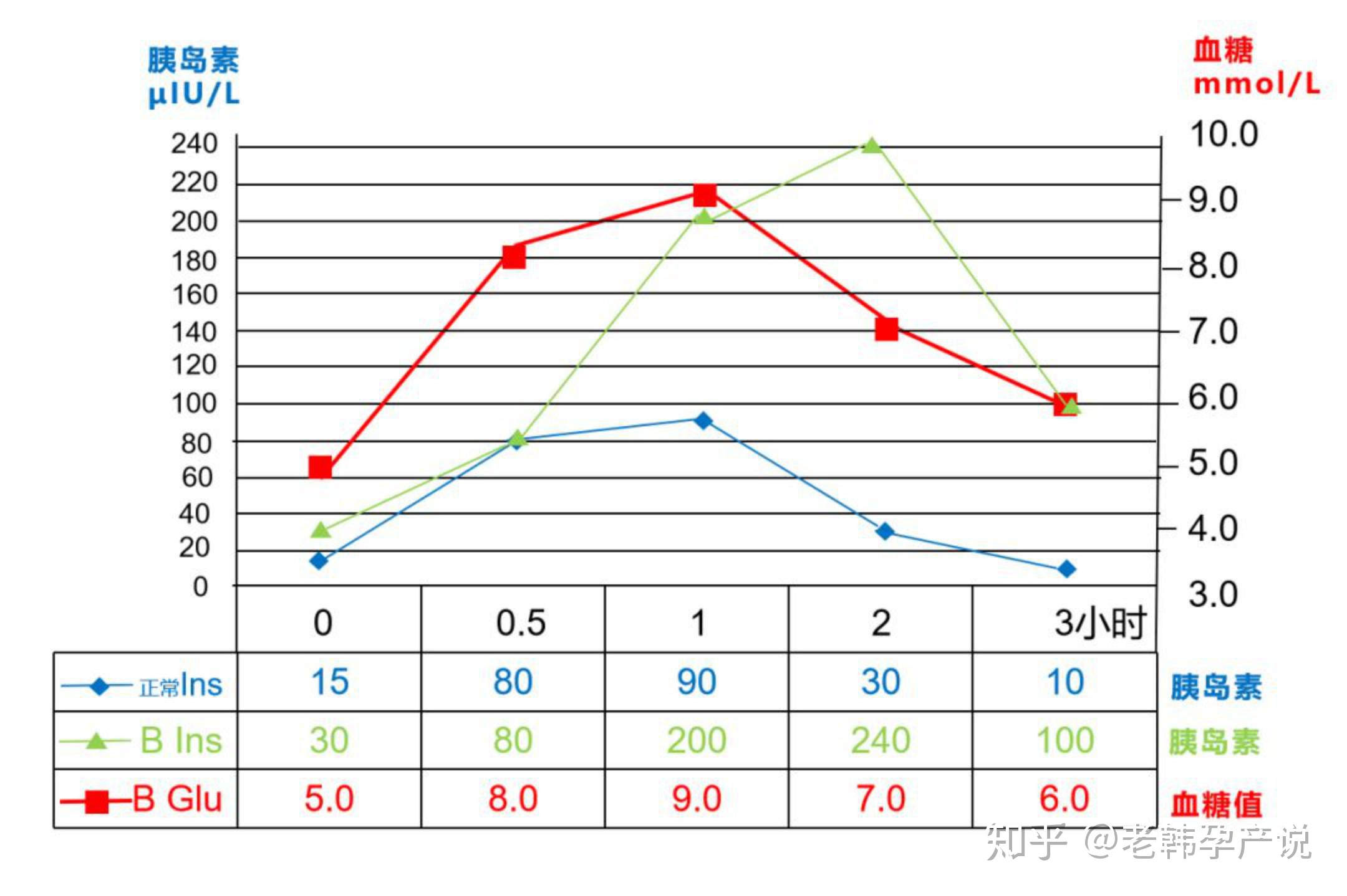 而Ins0.5h=80uIU/L分泌有所减少(早期分泌减少);虽然Ins1h=200uIU/L是空腹的5倍以上,但是高峰值Ins2h=240uIU/L出现在2小时,可以判断为胰岛素分泌高峰延迟。