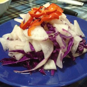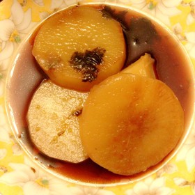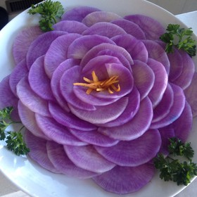 白萝卜的根肉质,长圆形、球形或圆锥形, 原产我国,品种极多,具有多种药用价值。日文称其为“大根”,形状和胡萝卜甚为相似。萝卜根部是最常见的蔬菜之一,但实际上整株植物都是可吃的。种子称为莱菔子,是常用的中药。
