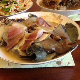 甲鱼是生活在江河湖海、池塘、水田以及陆地中的一种水生爬行动物。其头像龟,可伸缩,但背甲没有乌龟般的条纹,边缘呈柔软状裙边,壳较软。无论蒸煮、清炖,还是烧卤、煎炸,都风味香浓,营养丰富。甲鱼还具有较高的药用食疗价值。