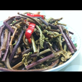 挑选蕨菜时要选绿色一点比较嫩,如果大都变成紫色的则比较老了。