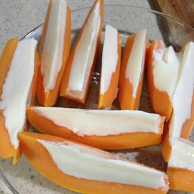 木瓜果实长圆形、卵形或洋梨形,成熟时果皮由绿变黄、橙黄色或红色。肉厚,肉质软滑,甜、有香味。一年四季皆有产,以9至10月所产最好吃。果肉可鲜食,腌制蜜饯、制作果酱和果汁罐头。