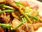 蒜苔,又称蒜毫,是从抽薹大蒜中抽出的花茎,人们喜欢吃的蔬菜之一,常被误写作“蒜苔”。蒜苔在我国分布广泛,南北各地均有种植,是我国目前蔬菜冷藏业中贮量最大、贮期最长的蔬菜品种之一。蒜苔是很好的功能保健蔬菜,具有多种营养功效。蒜苔性温,具有温中下气,补虚,调和脏腑,以及具有活血、防癌、杀菌的功效,对腹痛、腹泻有一定疗效。蒜苔加生菜,两者同食,可以杀菌消炎,降压降脂,益智补脑,防止牙龈出血,清理内热,以及补充维生素C缺乏。蒜苔加木耳,蒜苔对于脾胃虚弱、泄泻不止、毒疮水肿等病症有辅助治疗作用;木耳则益气养肥、凉血止血、降脂减肥。两者同食,其效大增。
