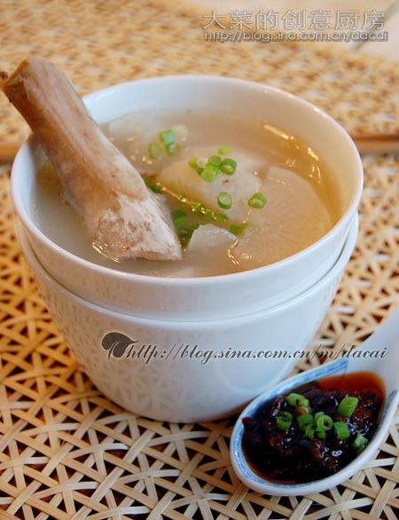 猪棒骨一劈为二,用沸水稍烫,取出洗净