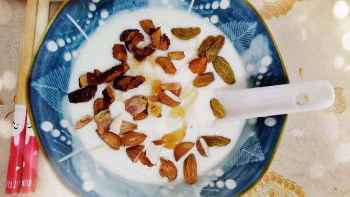 纯牛奶1000毫升,益生菌粉1条,奶粉20克,细砂糖50克,各色干果若干,蜂蜜1勺