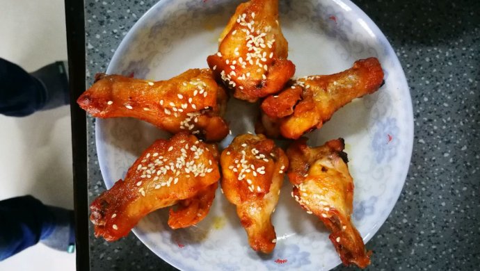 做法分解3:中层上下火200℃,烤20-25分钟,中途10分钟刷油取出翻面,在再烤10分钟再翻面刷油,撒上芝麻,最后烤5分钟