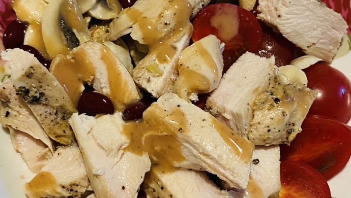 鸡胸肉2块,小番茄6个,味好美香甜味沙拉酱适量,味好美焙煎芝麻风味沙拉汁适量,黑胡椒碎2克,盐1克,料酒少许,玉米油少许,姜粉适量,白胡椒粉适量勺